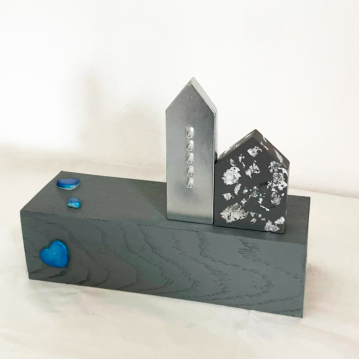 Base de fusta fosca amb vetes naturals, s’aixequen dues figures arquitectòniques: una casa en to platejat elegant i una altra en negre intens amb textures de fulla d’argent que evoquen la bellesa del pas del temps. Pensada per a persones modernes que busquen una forma diferent i estètica de preservar la memòria dels seus éssers estimats